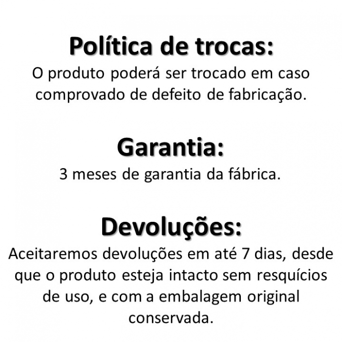 NÃO NOS RESPONSABILIZAMOS POR MÁ INSTALAÇÃO, USO INADEQUADO DO PRODUTO OU ADAPTAÇÕES QUE NÃO SÃO COMPATÍVEIS COM A APLICAÇÃO CORRETA SEGUNDO O FABRICANTE.